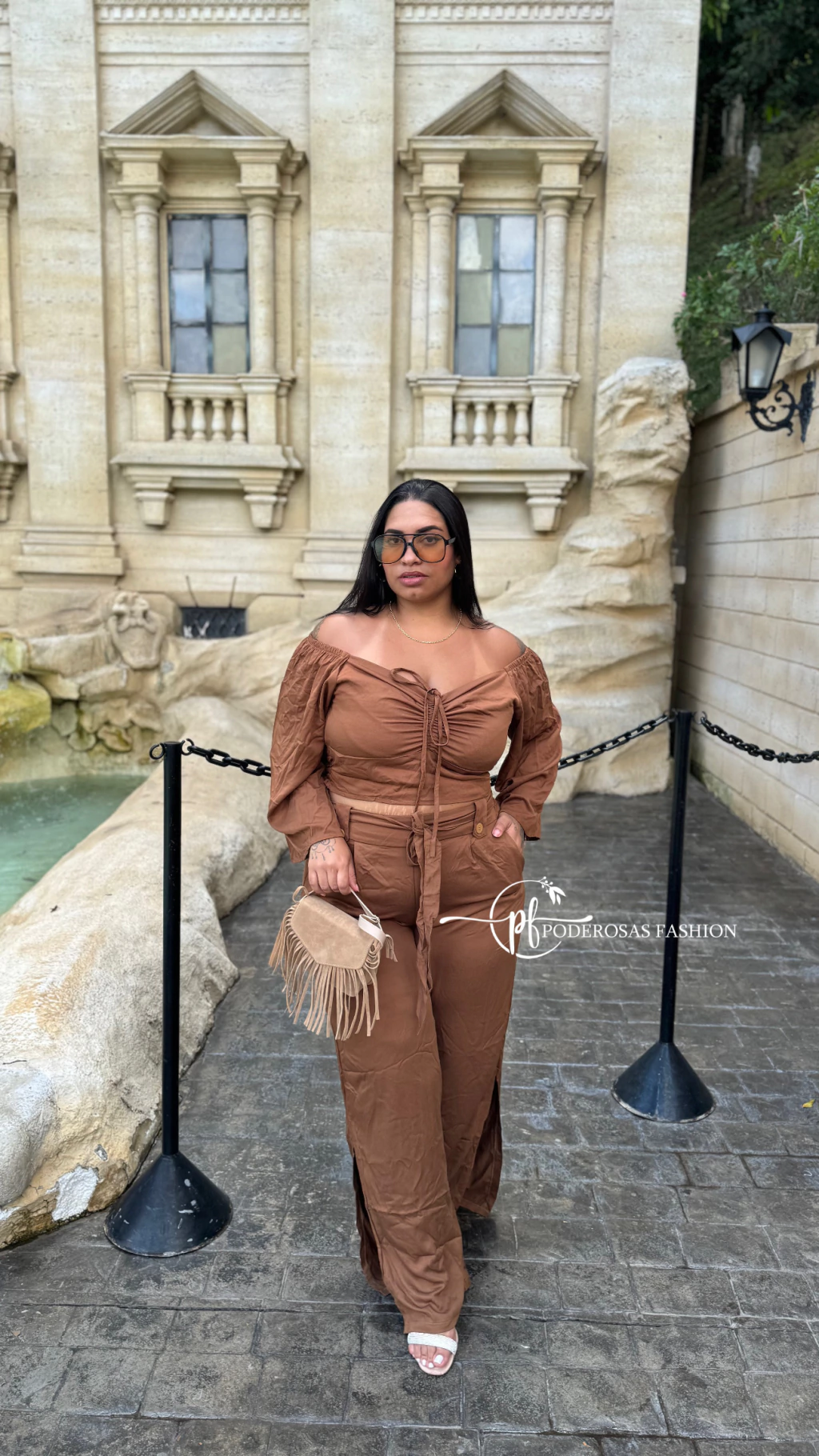 ✔ Calça Pantalona: Cintura alta com detalhe em botão e amarração, além de bolsos frontais funcionais. O corte amplo garante movimento e um visual sofisticado.