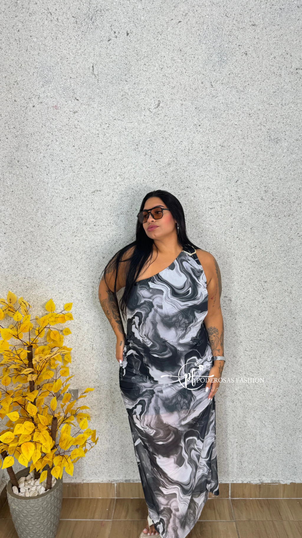 Esse vestido de tule com estampa marmorizada é puro charme e estilo “moda gringa”! O modelo é de um ombro só, trazendo uma proposta moderna e ousada, perfeita para quem ama se destacar. O tecido em tule com forro valoriza as curvas com leveza e caimento fluido, além de ser super confortável.